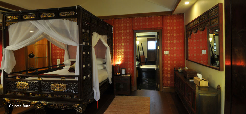 Chinese Suite (highly recommended), comprising two double rooms en suite, living room and two private terraces is situated in a separate building overlooking the swimming pool and furnished with fine antique Chinese furniture and doors, modern prints and fabrics, the private seclusion of this suite is ideal for a family.